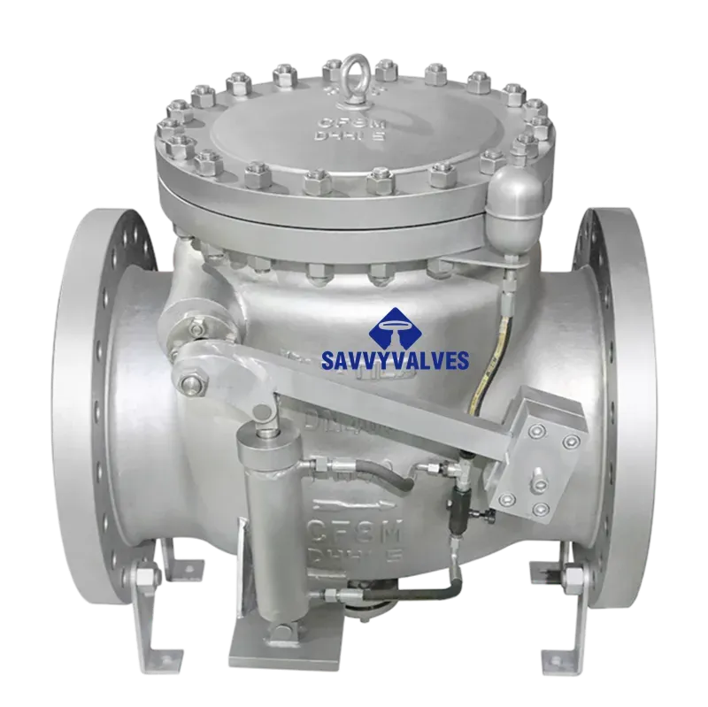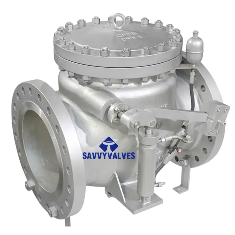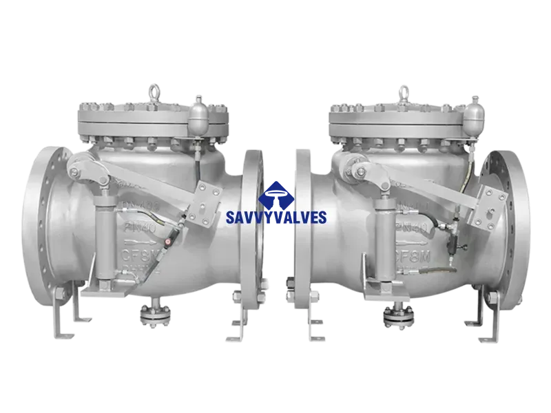 This large‑diameter flanged swing check valve features a metal‑to‑metal seated design and is equipped with a counterweight assisted closure system. The disc opens automatically under forward flow. When flow decelerates or a reverse flow tendency occurs, the counterweight, acting through a lever mechanism, rapidly assists disc closure. This significantly reduces closure time and mitigates water hammer, protecting the piping system. The valve is widely used at pump discharges, high‑pressure pipelines, and long‑distance transmission systems where reliable check performance is critical.