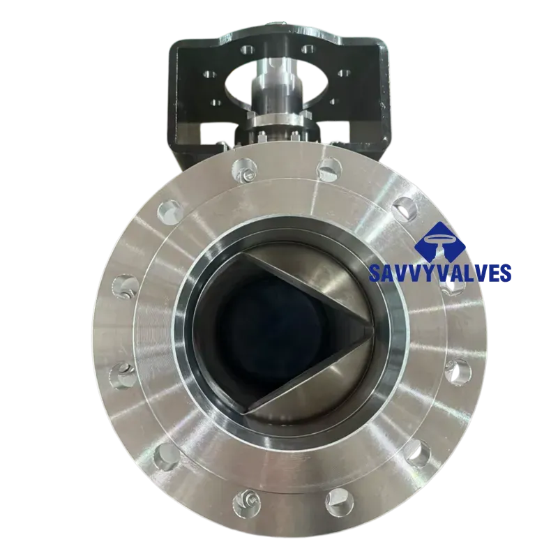 The trunnion mounted V-port control ball valve is a quarter-turn rotary control valve featuring a trunnion-supported ball design. The ball is fixed on upper and lower stems with bearing supports, providing excellent stability, low operating torque, and high pressure bearing capacity. The V-notch on the ball offers an inherent flow characteristic close to equal percentage and a rangeability up to 300:1.