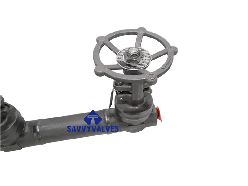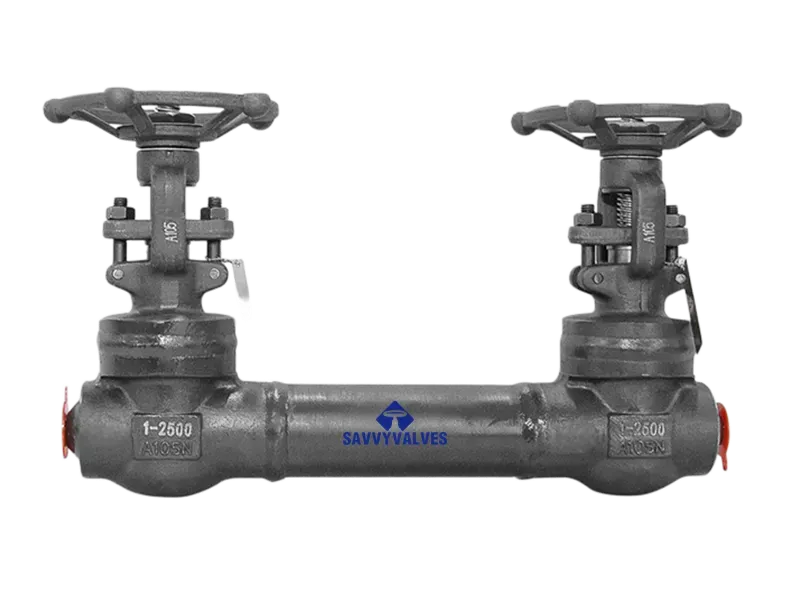 پیکربندی: Two high-pressure forged steel gate valves welded into a single integrated body assembly