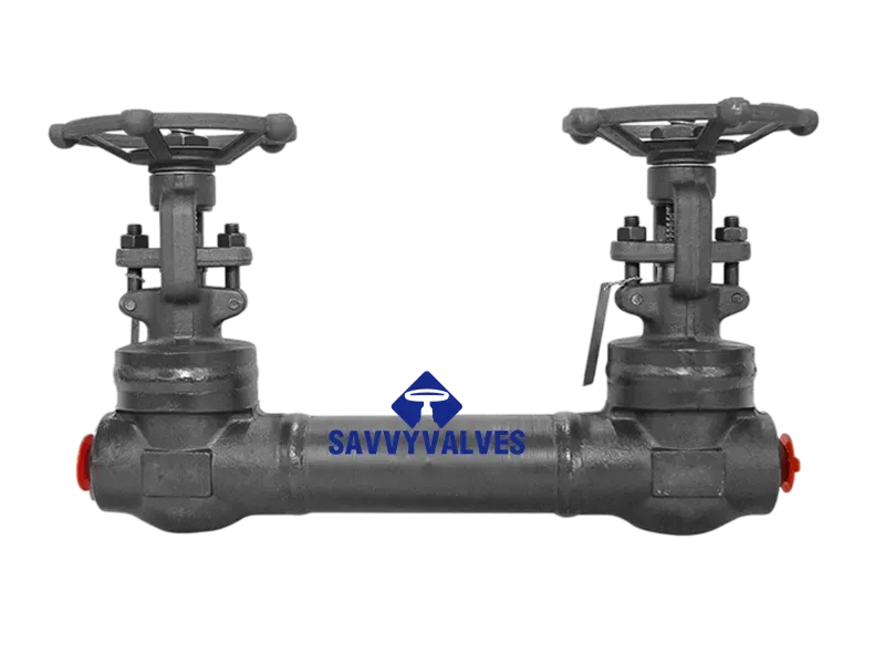 This valve consists of two forged steel gate valves welded together to form a compact, single-unit double block isolation assembly. The double block configuration provides two independent sealing barriers, ensuring positive isolation even in the event of a single seal failure. This assembly is ideal for critical applications such as high-pressure steam, hydrogen, hydrocarbon, and chemical services where absolute shut-off, safety, and system integrity are paramount. Each valve operates independently, allowing for cavity pressure monitoring, testing, or venting between the two blocks. All connections are butt weld (BW) ends, ensuring leak-free, permanent piping integration.